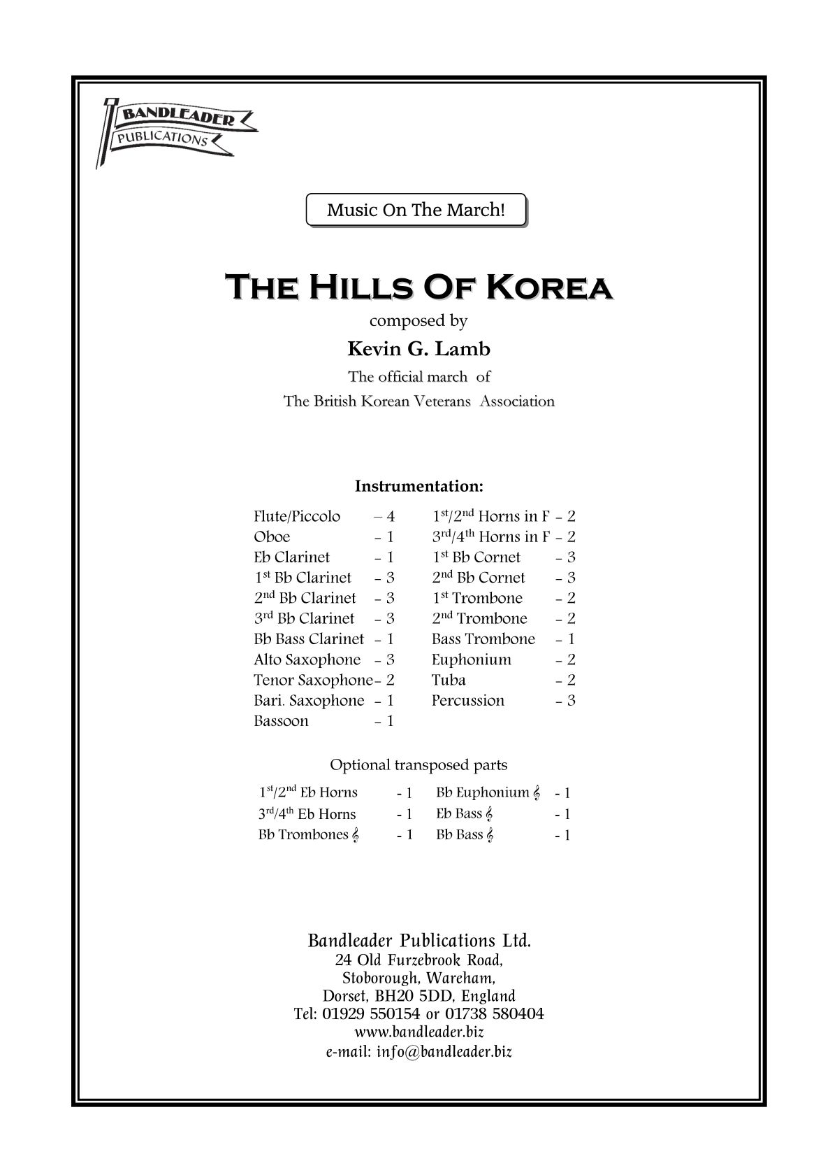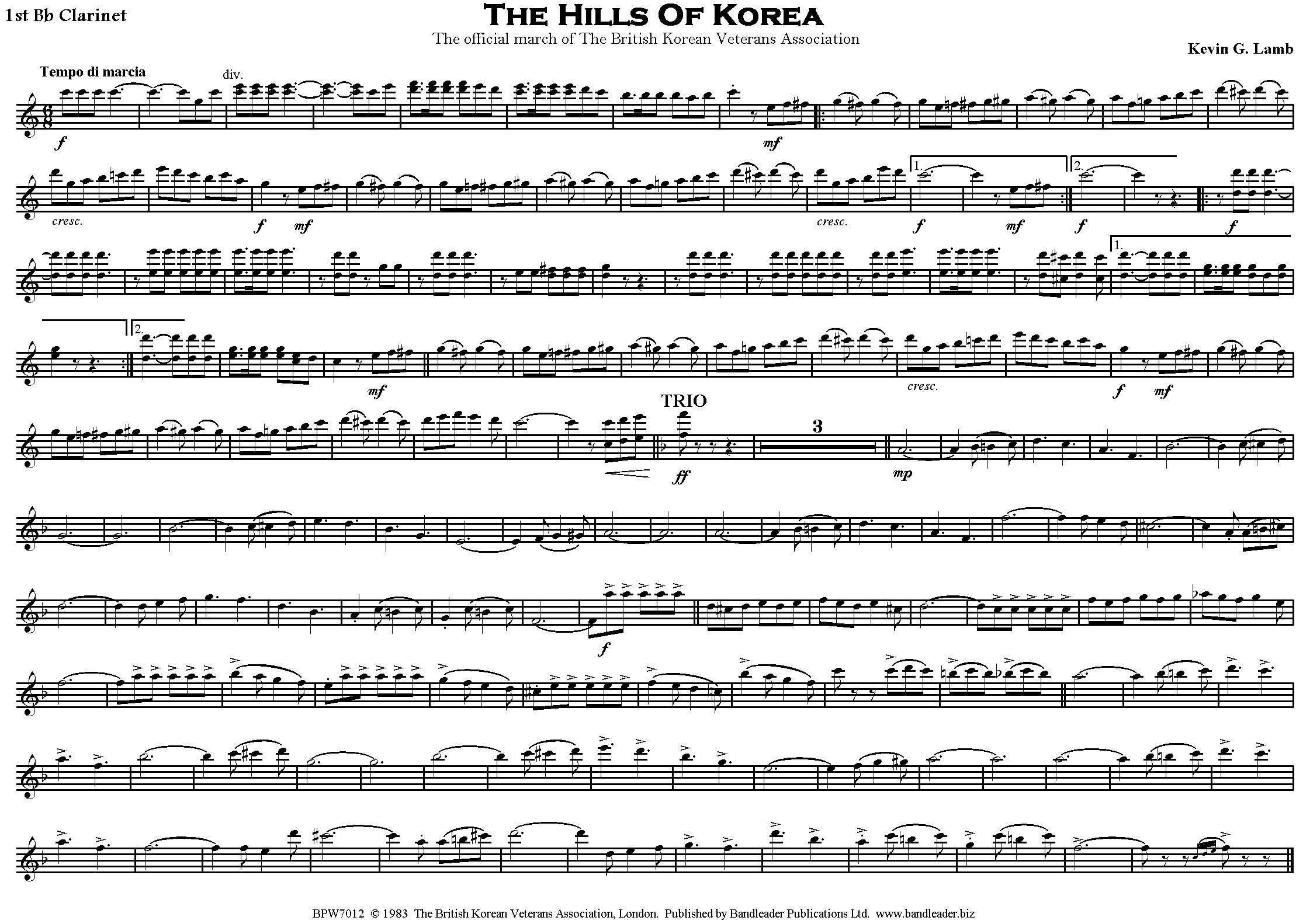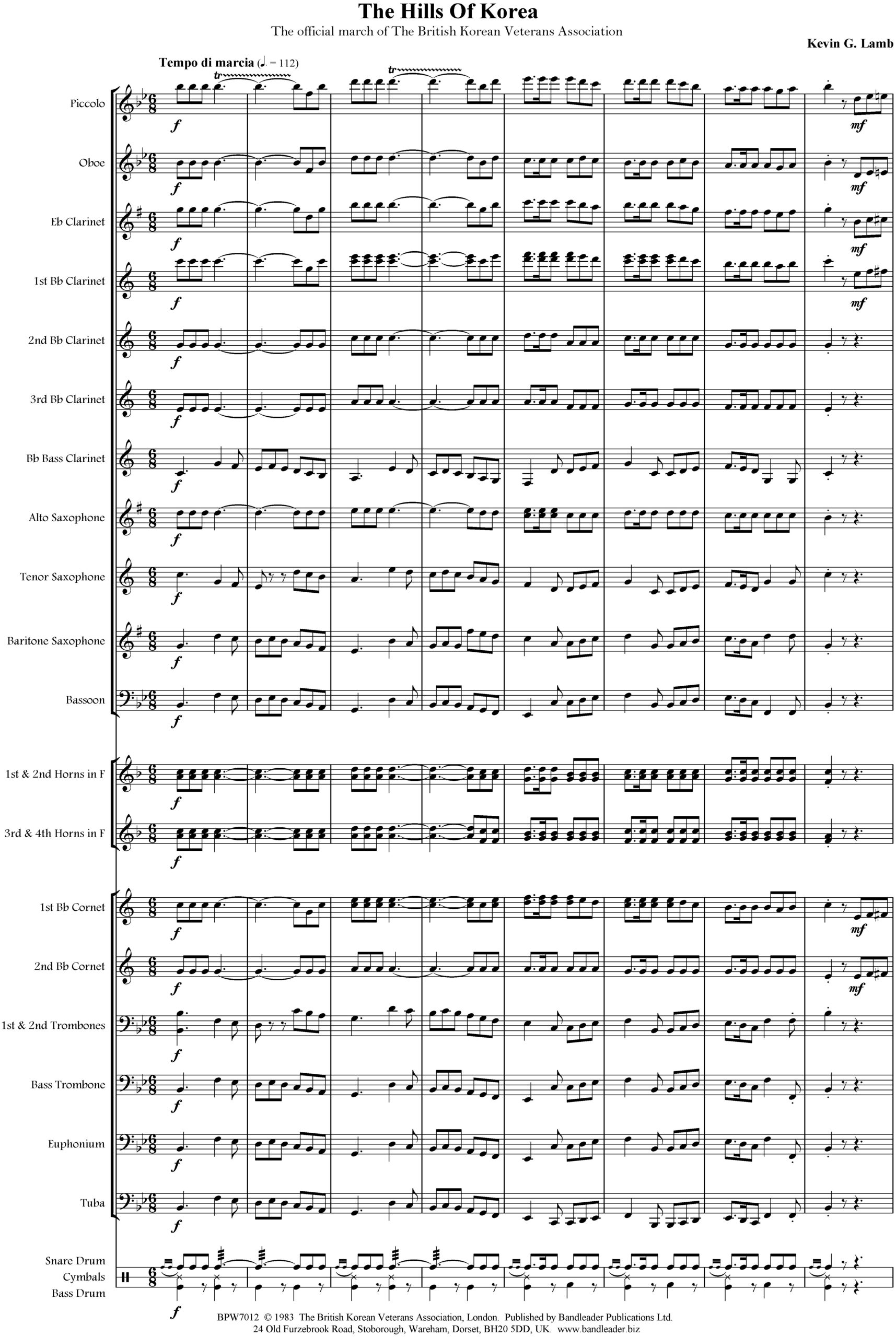Another competition winner from Kevin Lamb, former Head of School and Chief Instructor at the Royal Military School of Music, Kneller Hall, in London. This is a superb lilting six-eight march and the official march of The British Korean Veterans Association – hence the title!