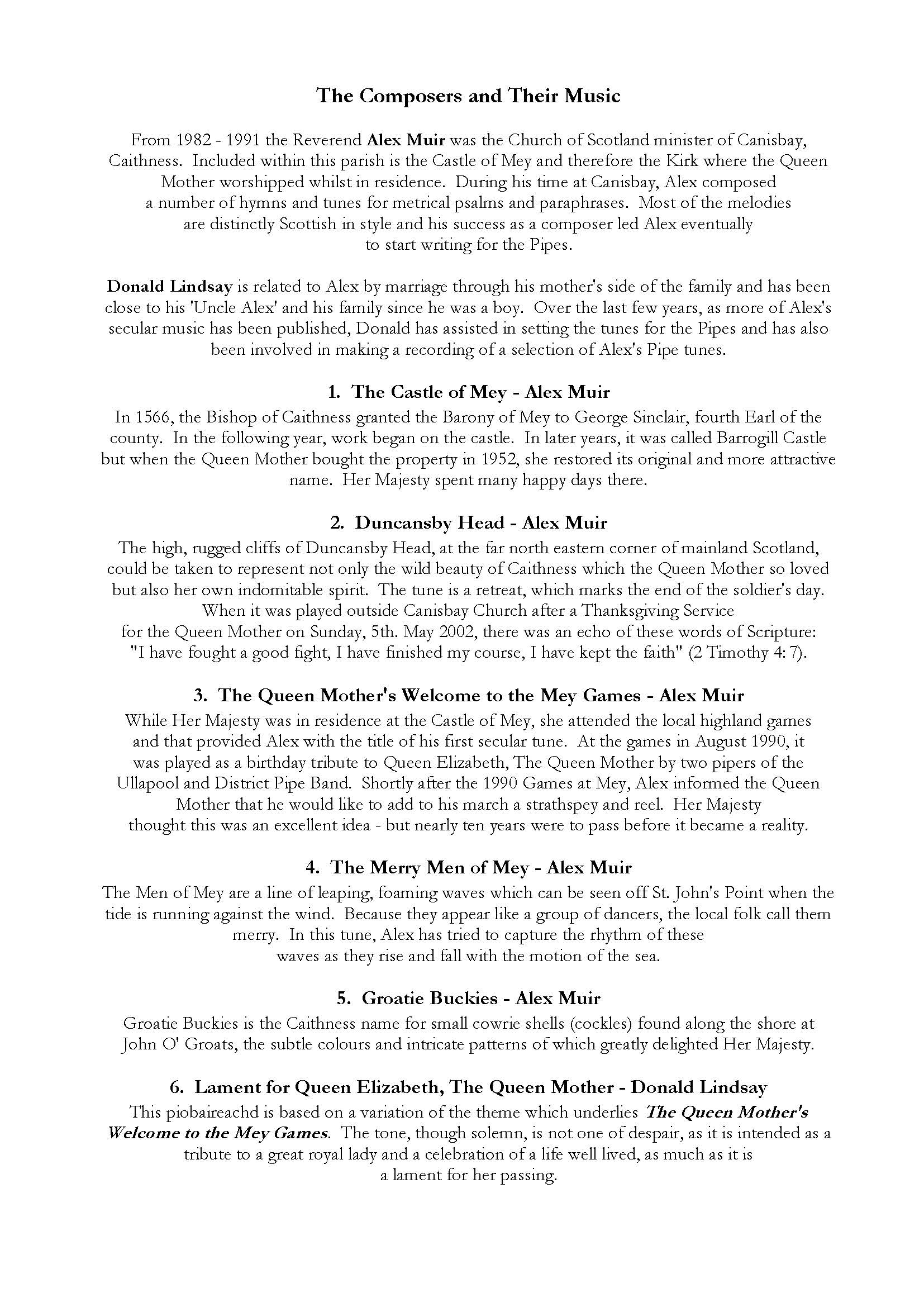 Dedicated to and sanctioned by Her Majesty Queen Elizabeth, The Queen Mother. This set consists of music specially composed for Her Majesty which she enjoyed listening to on many occasion and also includes short biographies on the composers and notes on each melody.