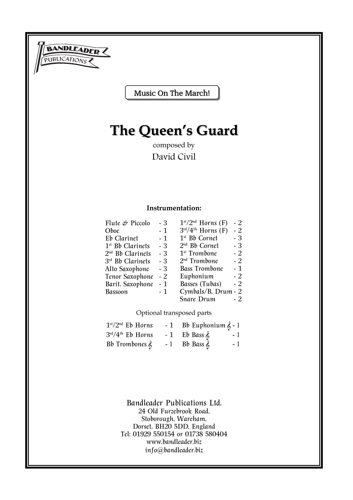 A superb new ‘six-eight’ march by David Civil. “The Queen’s Guard” is full of lilting melodies and rhythmic vitality, ideal for all occasions – on the concert stage, on parade or as part of your marching displays.